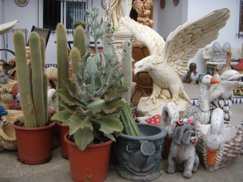 Tenemos gran cantidad de plantas de exterior dependiendo de la estación. Además de todo tipo de arboles de sombra como, sauces, chopos..., tenemos un gran surtido de flores decorativas, desde los típicos rosales y bougambillas, hasta una exótica bromelia.